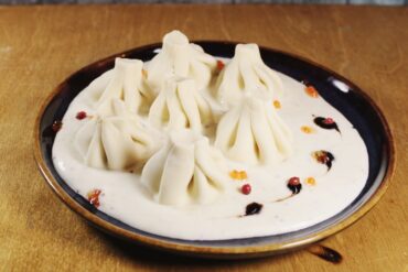 15₾Shrimp khinkali in a creamy white sauce.