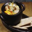 Tender sturgeon stewed in a clay pot with potatoes, eggplant, tomatoes, and Georgian spices. -