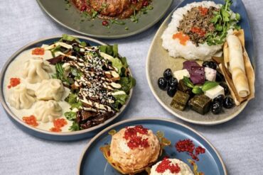 salad with apple chips, Khinkali — Lamb , Gomi & Kuchmachi — sturgeon liver & caviar, Aged Cheese — aged cheese set (honey, wine, thyme), Main Course — Lamb Chanakhi, Dessert — matsoni ice cream with ombalo and adjika