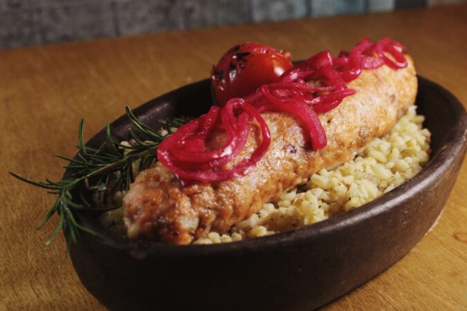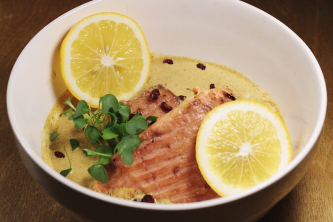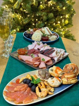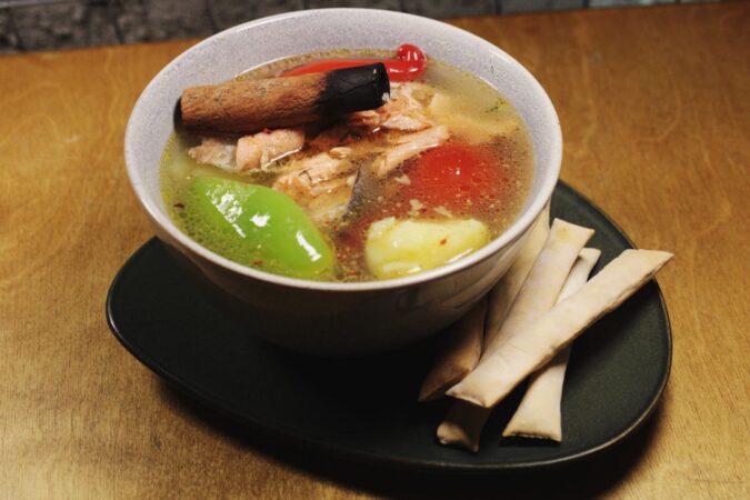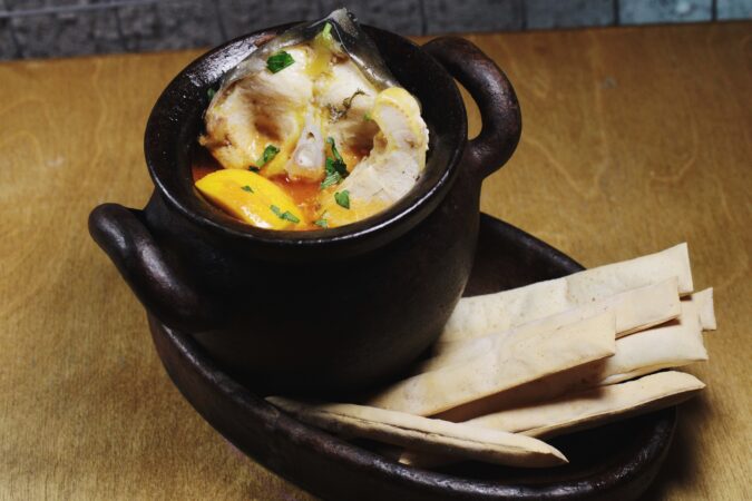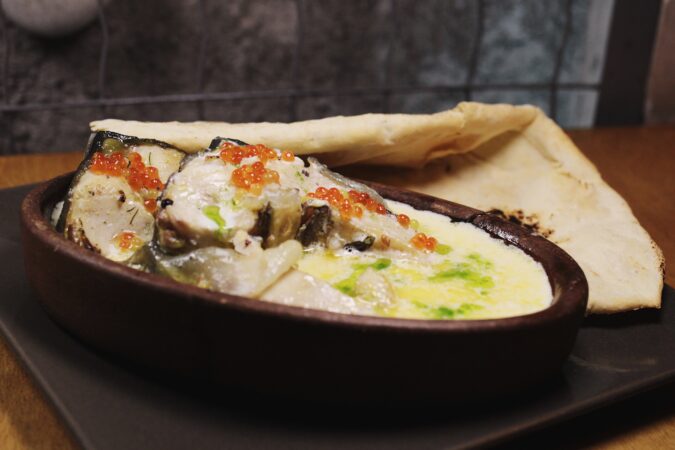салат с яблочными чипсами, Khinkali — креветки в соусе, Gomi & Kuchmachi — печень осетра и икра, сет сыров (мёд, вино, тимьян), Main Course — Апхазура, Dessert — мороженое мацони…