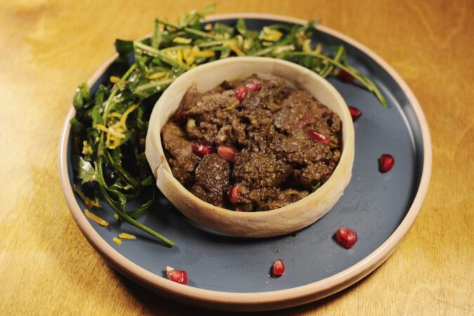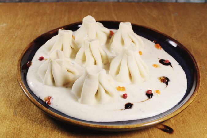 Салат с яблочными чипсами, Khinkali из баранины, Gomi & Kuchmachi — печень осетра и икра,Aged Cheese — сет сыров (мёд, вино, тимьян),Main Course — чанахи из баранины , Dessert —…